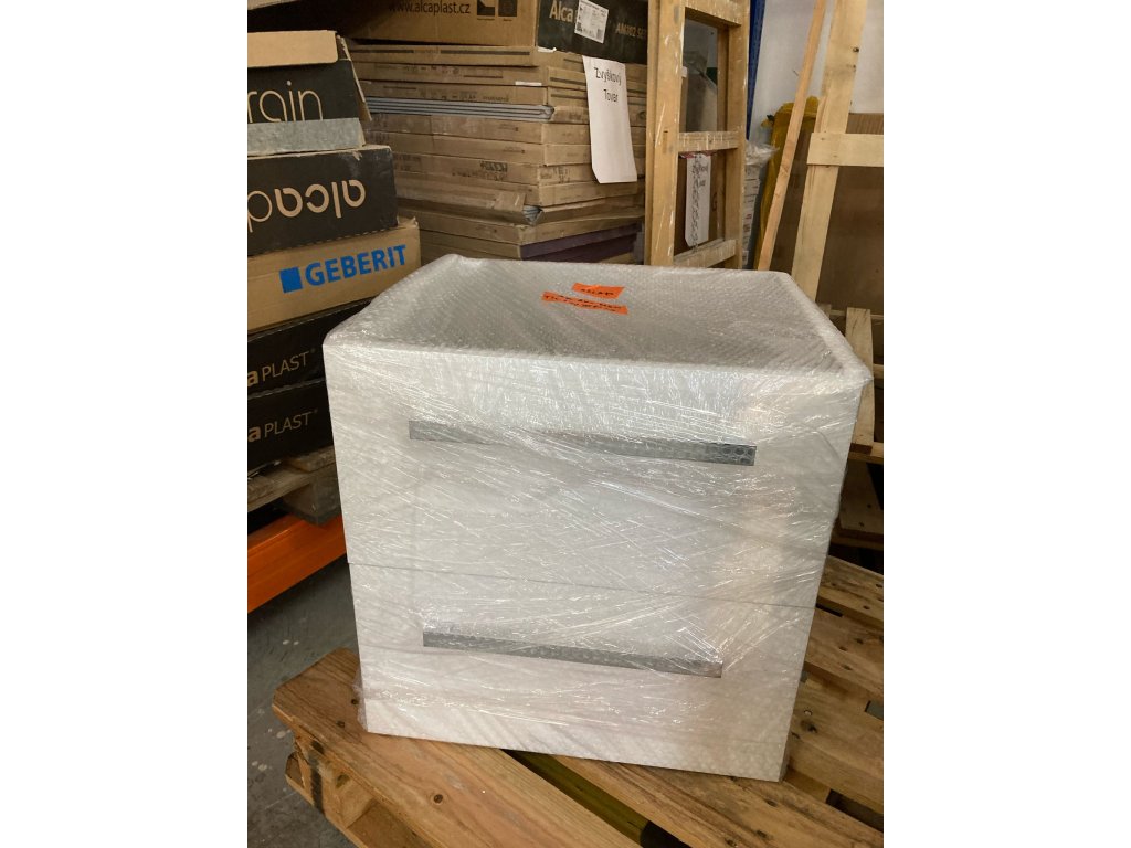 Skrinka s 2 zásuvkami, vrchná s organizérom a výrezom na sifón, úchyty v prevedení chróm v balení, rozmer 51,6 x 46 x 52 cm