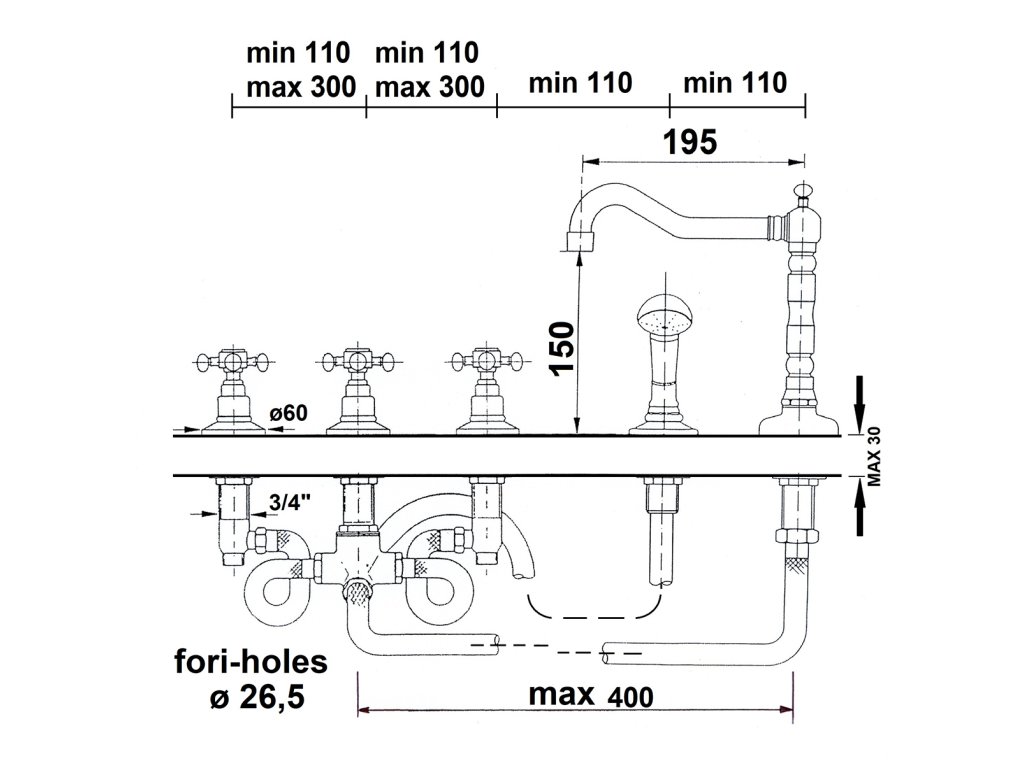 ANTEA päťprvková batéria na okraj vane s retro hubicou, brúsený nikel