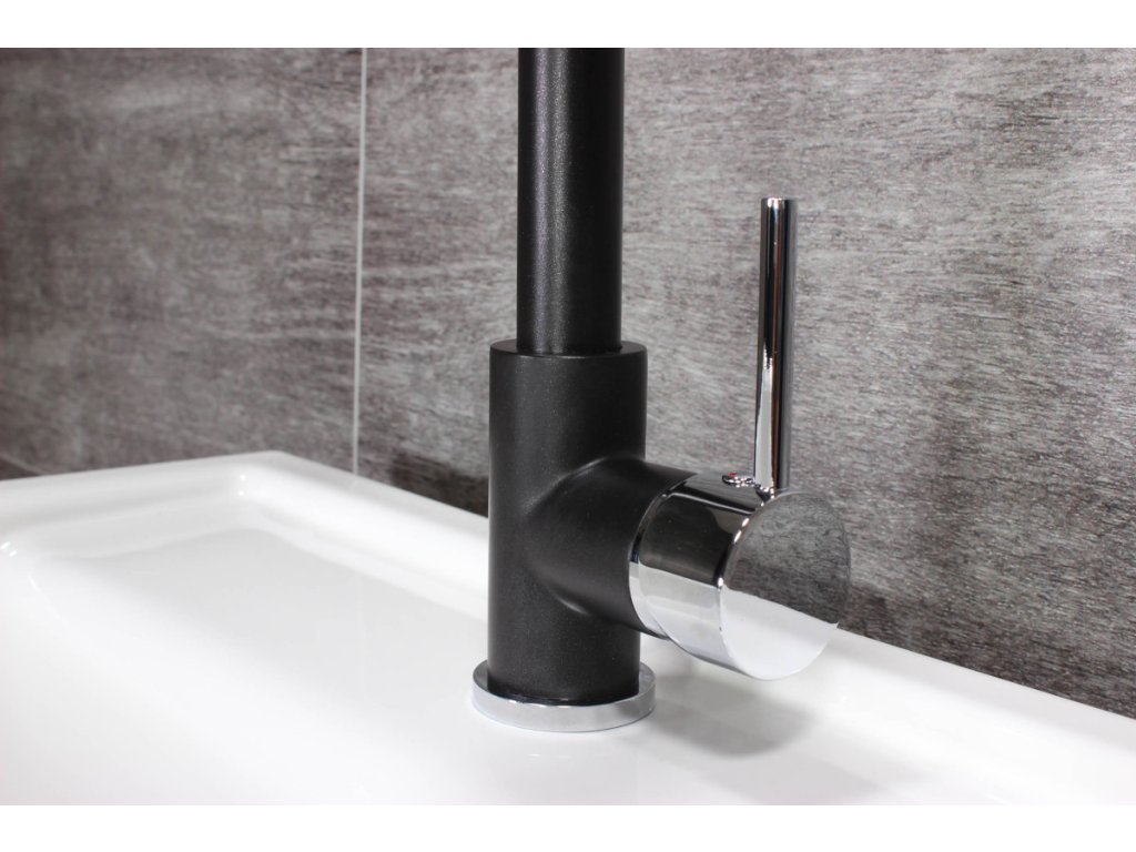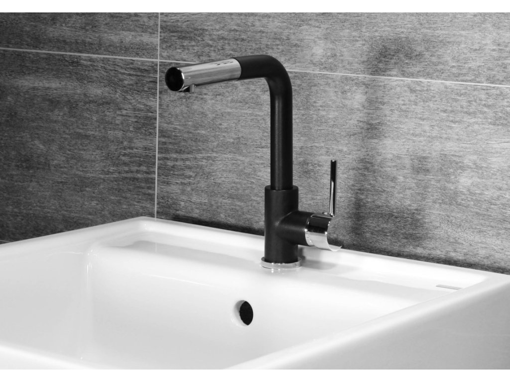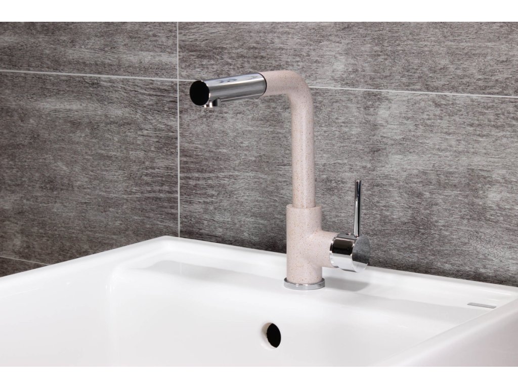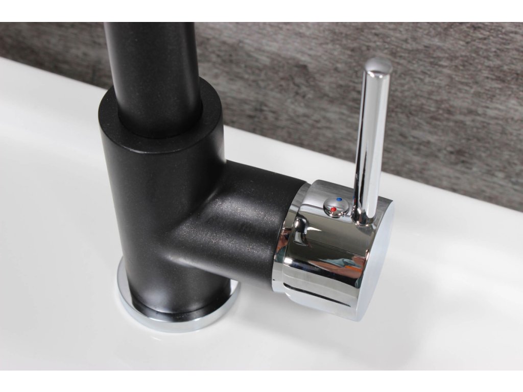 Povrch drezovej batérie je vyrobený z drvenej žuly. Čierna granitová batéria, ale aj piesková, biela alebo šedá skvele doplní granitový drez v podobných odtieňoch. Samozrejme je možné túto pákovú batériu použiť aj pri nerezových drezoch, kde ozvláštni celkový dojem umývacieho centra.