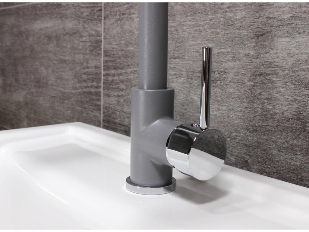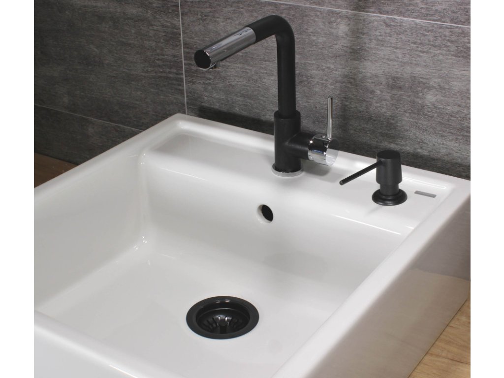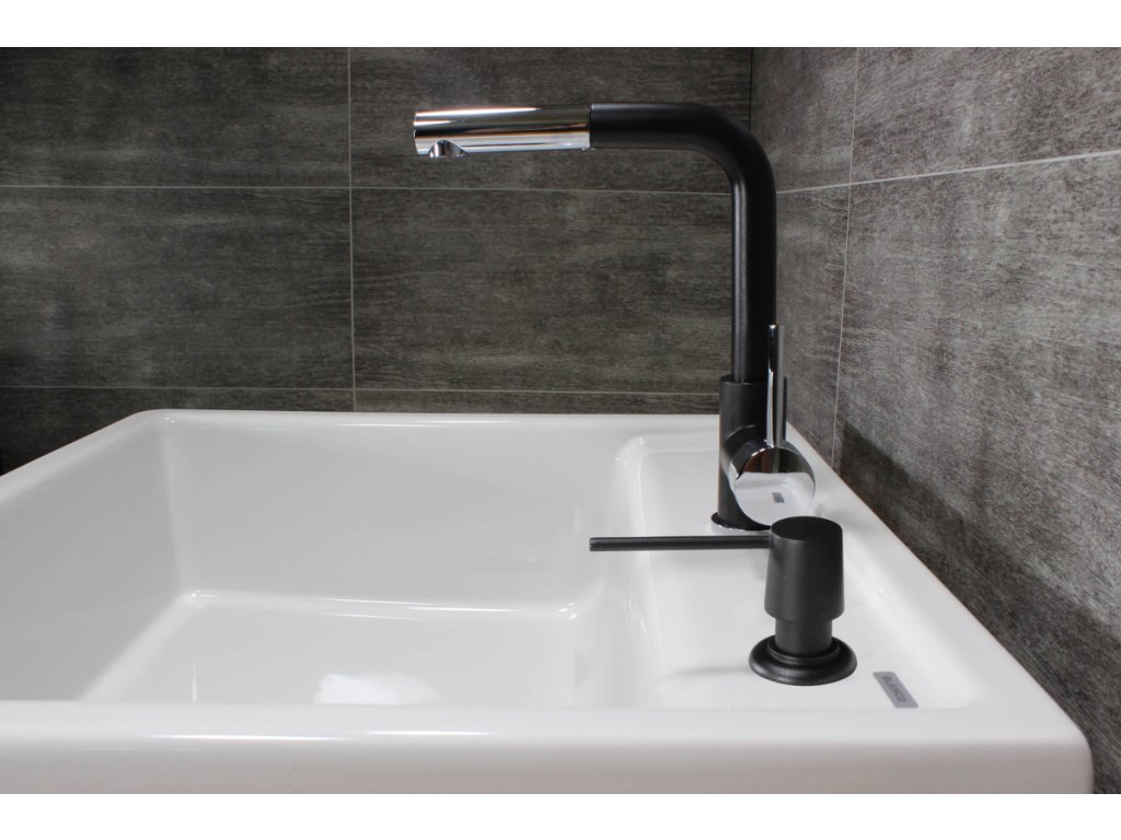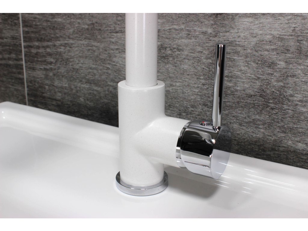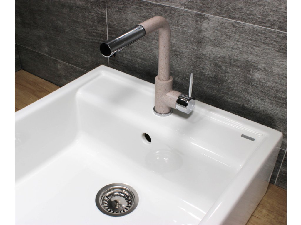 Povrch drezovej batérie je vyrobený z drvenej žuly. Čierna granitová batéria, ale aj piesková, biela alebo šedá skvele doplní granitový drez v podobných odtieňoch. Samozrejme je možné túto pákovú batériu použiť aj pri nerezových drezoch, kde ozvláštni celkový dojem umývacieho centra.