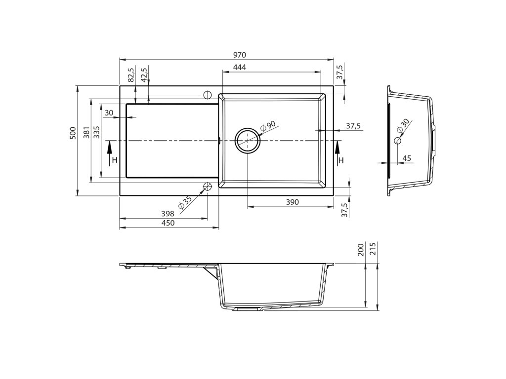 Drez granitový zabudovateľný s odkvapom, 97x50cm, čierny