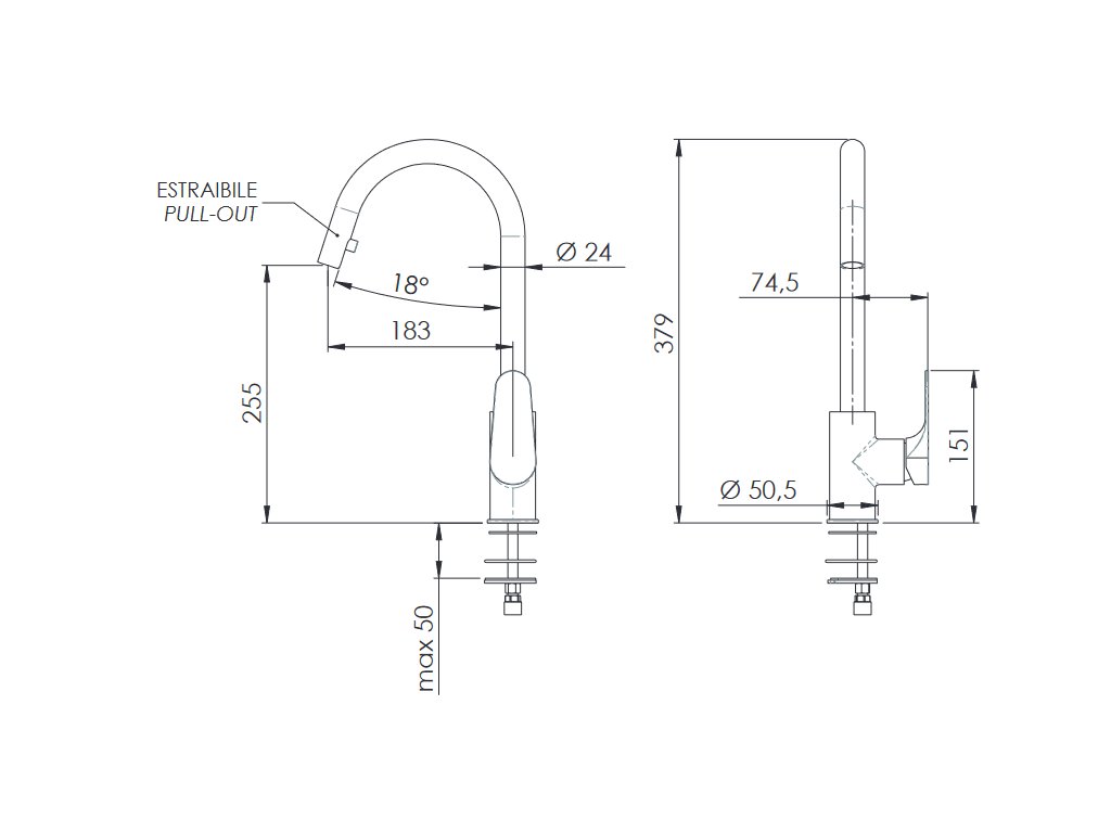 Otočná drezová stojanková batéria FONTI 84 s výsuvnou sprchou vyniká vysoko kvalitným spracovaním a spoľahlivou funkčnosťou všetkých súčastí a materiálov.