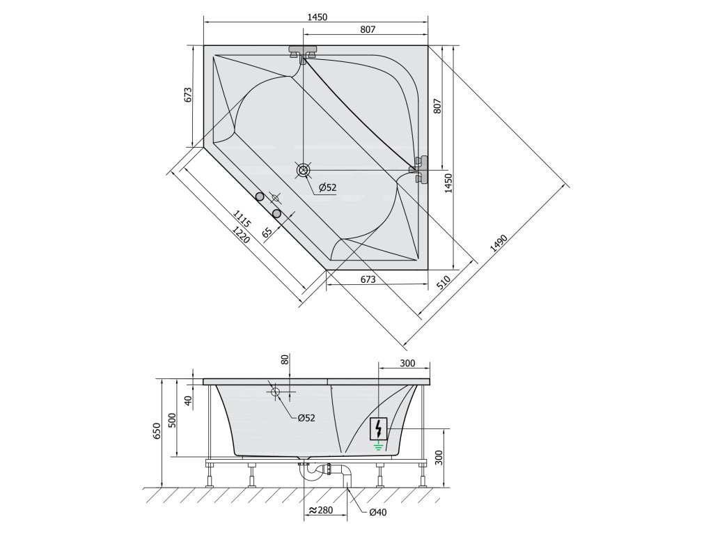FLOSS hydromasážna vaňa, 145x145x50cm, Active Hydro, chróm