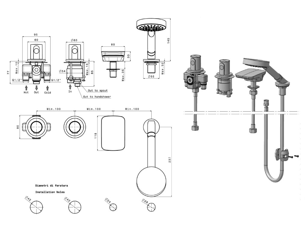 GLAM štvorprvková termostatická batéria na okraj vane, chróm