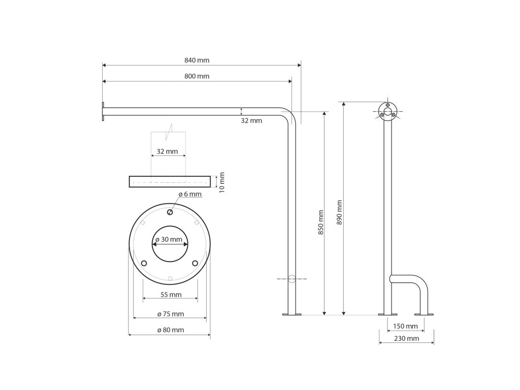 HANDICAP oporné madlo pravé 800x850mm, nerez lesk