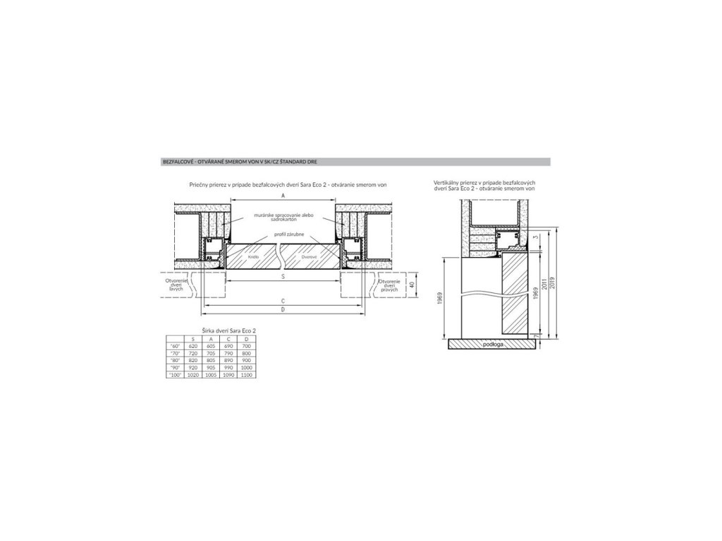 Skryté dvere DRE SARA ECO 2 s integrovanou zárubňou predstavujú elegantné riešenie, kde dvere a zárubňa tvoria jednotný celok a sú priamo zabudované do steny, ktorá má rovnakú hrúbku ako samotné dvere (40 mm). Tento model umožňuje moderné a kreatívne projektovanie interiéru pomocou dverí, ktoré sú takmer neviditeľné, pričom povrch krídla môže byť prispôsobený farbe steny. Po inštalácii hliníková zárubňa nie je viditeľná, zvyšuje sa tak dojem plynulého prechodu medzi stenou a dverami, pričom jediným viditeľným prvkom je jemný spoj.Povrchová úprava dverí Grunt - určené na maľovanie a tapetovanie.V štandardnom prevedení sú dvere dodávané s dvoma pántami a výplňou z voštiny. Za príplatok je možné dvere dodať aj s tromi pántami, pričom výplň bude pozostávať z dierovanej drevotriesky.Dodatočné parametre