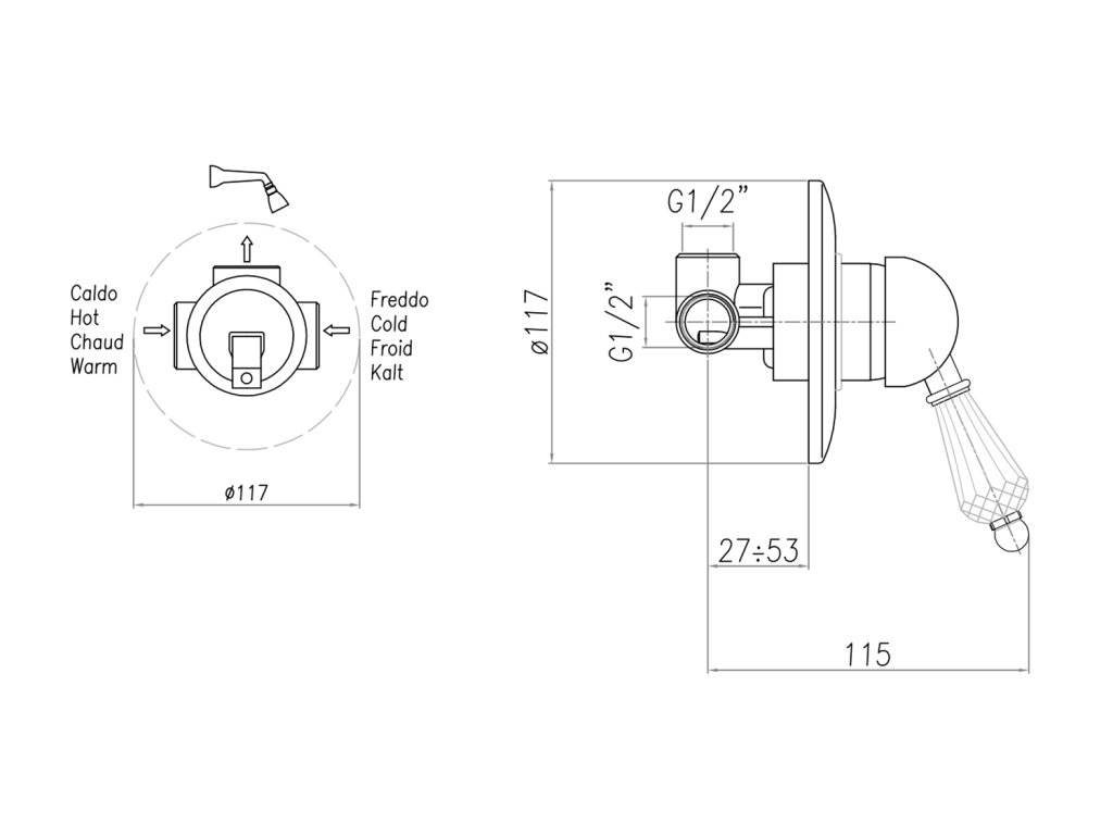 KIRKÉ CRYSTAL podomietková sprchová batéria, 1 výstup, krištáľová páčka, zlato