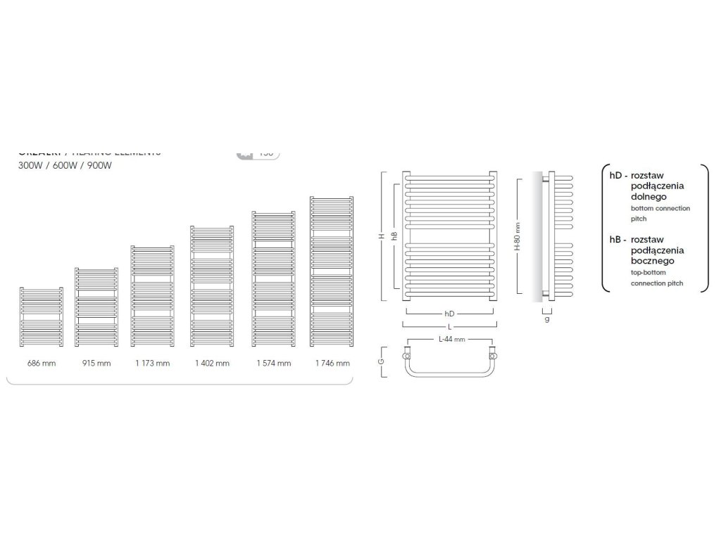 - 400 × 686 mm (bočné pripojenie), výkon 378 W (vykurovacia tyč 400 W)