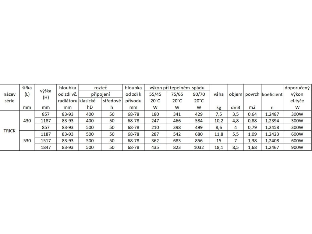 - 530 × 1187 mm, výkon 542 W, (vykurovacia tyč 600 W)