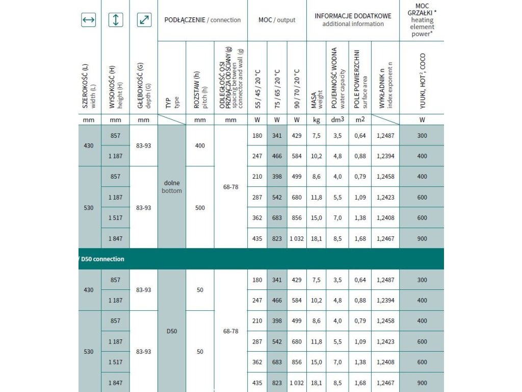 - 530 × 1187 mm, výkon 542 W, (vykurovacia tyč 600 W)