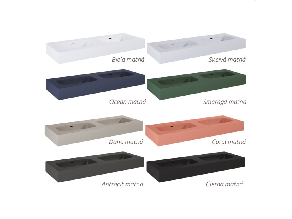 Nástenné umývadlo v ôsmich farebných prevedeniach: biela, svetlá sivá, duna, coral, ocean, smaragd, antracit, čierna