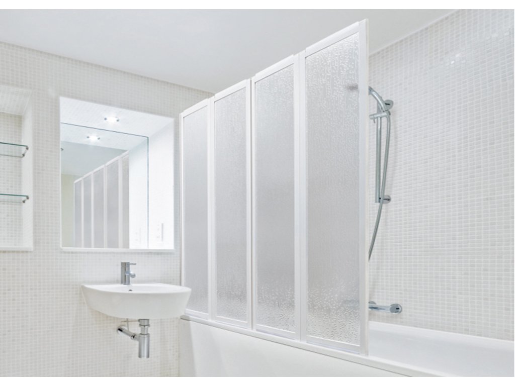 Vaňová zástena Vaňová zástena LUX L4 . Všetky modely sú vyrábané v plastovej výplni – vzor stekajúca voda o hrúbke 2,2 mm orámované hliníkovými profilmi bielej farby. Uvedená séria sa vyznačuje otváraním alebo sklápaním prostredníctvom pántov umiestnených vo vertikálnych profiloch. Dvierka sa montujú čo najbližšie k vnútornej hrane vane, vaničky alebo múrika, pretože nemajú žiadny spodný vodiaci profil a tesnosť je zabezpečená iba vďaka gumenému tesneniu na spodnej strane dvierok. Výška 140 cm.Dodatočné parametre