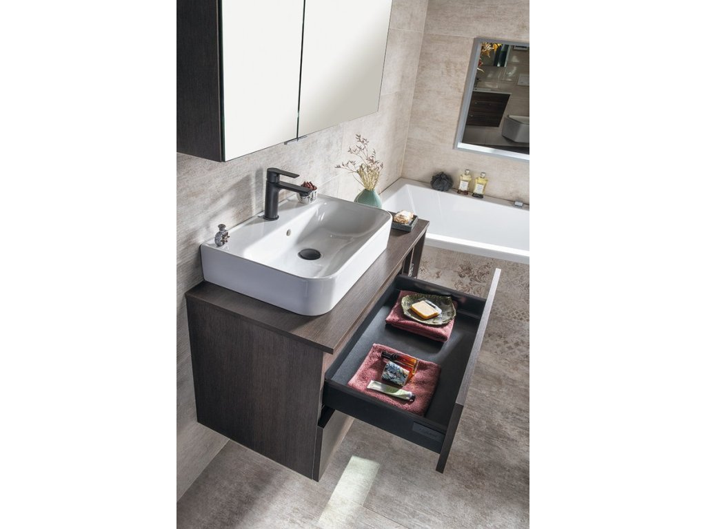 Séria ODETTA ponúka umývadlové skrinky v kombinácii s 3 druhmi umývadiel - keramické KARE, z liateho mramoru GODIVA a betónové QUADRADO. Séria je tiež navrhnutá pre vybrané umývadlá na postavenie. Rozmerovú variabilitu umožňuje kombinácia umývadlových a spodných skriniek. Bezúchytkové zásuvky sú vybavené výsuvmi BLUM s tlmeným dovieraním. Horná zásuvka je bez výrezu pre sifón, čím sa zvyšuje úložná plocha zásuvky. Medzi zásuvkami je hliníková lišta CHANEL v čiernej alebo bielej farbe. Na prianie je možné dodať lištu aj v zlatej farbe.