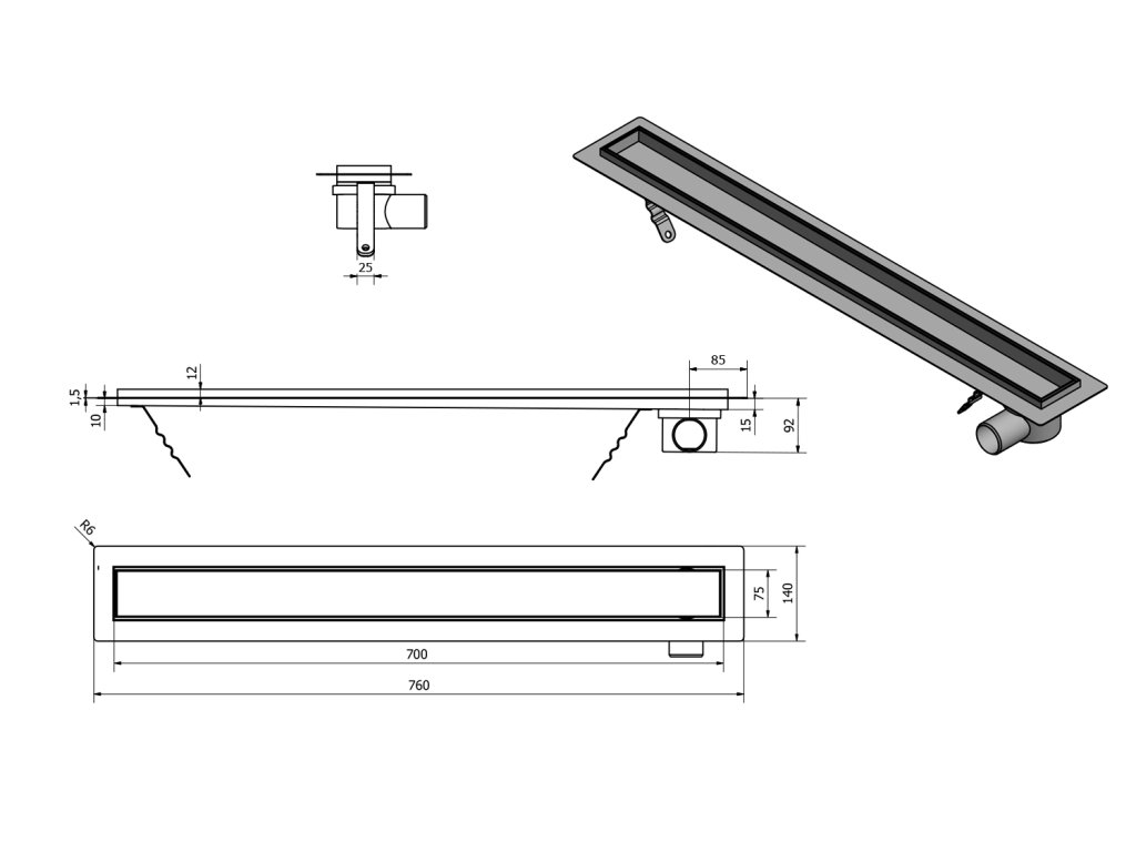 PAVINO podlahový žľab z nerezové oceli s roštom na dlaždice, L-760, DN50
