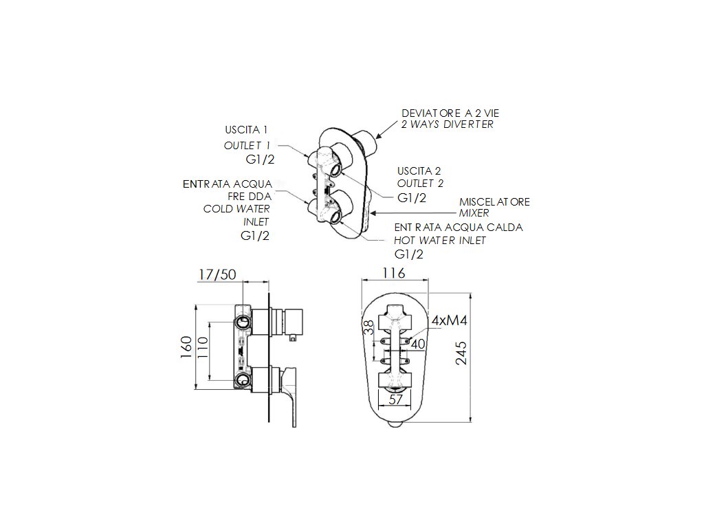 - Sprchová batéria podomietková, bez príslušenstva, s prepínačom, 2 výstupy