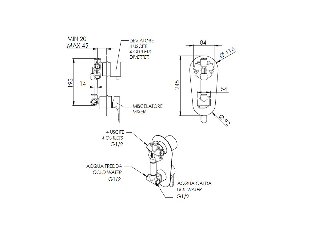 - Sprchová batéria podomietková, bez príslušenstva, s prepínačom, 4 výstupy