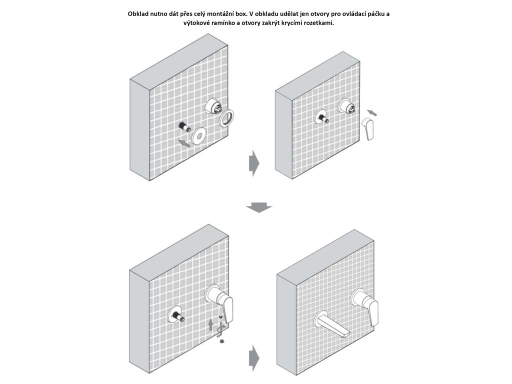 Dodávané vrátane podomietkového modulu. Pri tomto type batérie je nutné obklad dať cez celý už osadený montážny modul. V obklade urobiť len otvory pre ovládaciu páčku a výtokové ramienko a otvory zakryť priloženými krycími rozetkami.