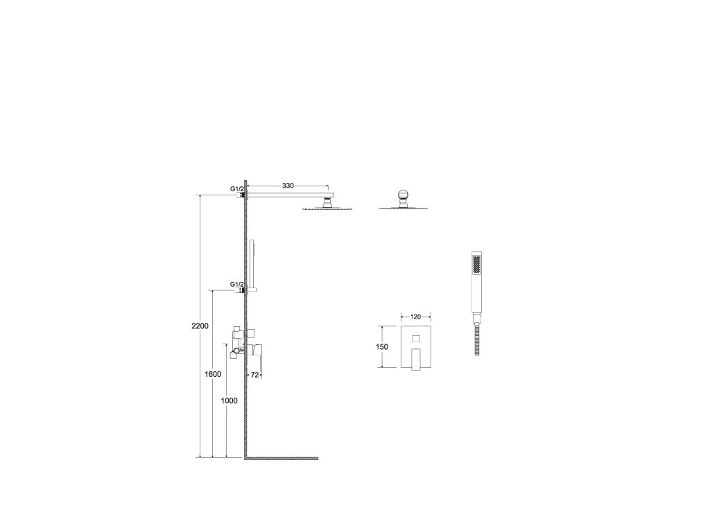 - Set obsahuje podomietkovú batériu, vývod zo steny, ručnú sprchu, hadicu sprchy a držiak, hlavovú sprchu