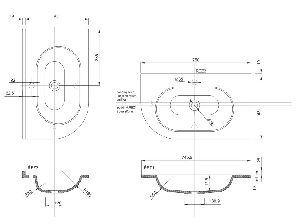 PULSE liaty mramor umývadlo 75x45cm, pravé, biele
