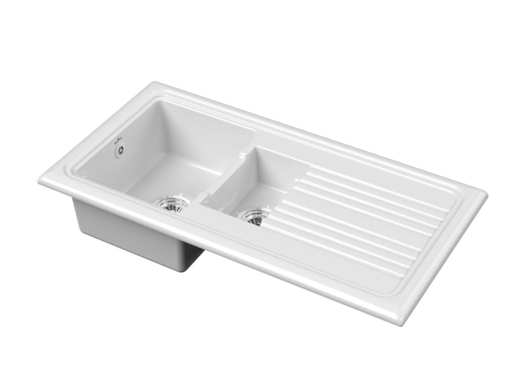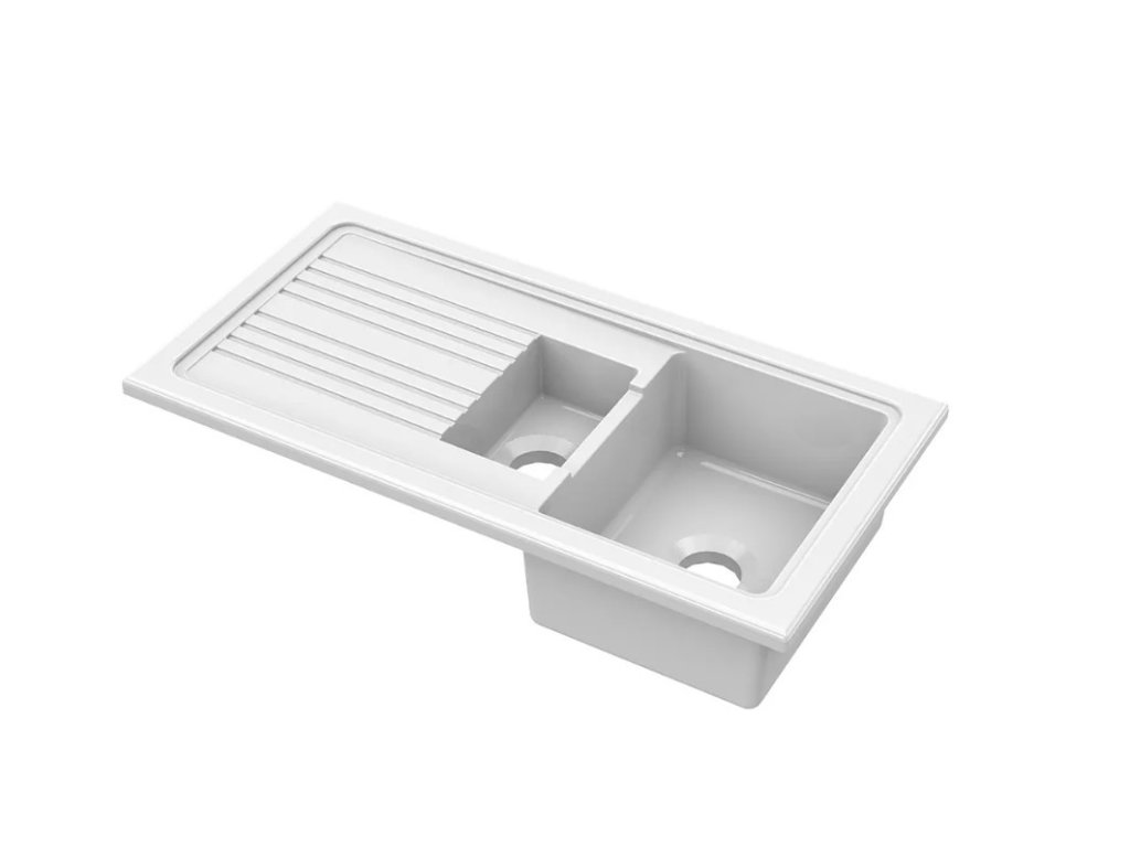 - žiarivo biely keramický drez vo vysokom lesku s odkvapkávačom a vaničkou