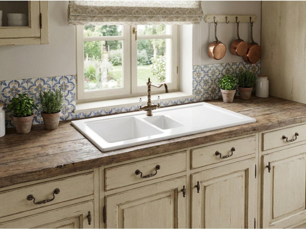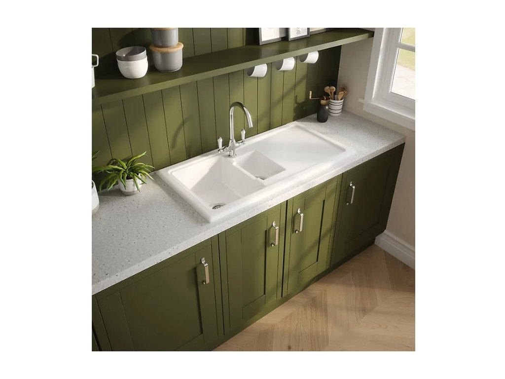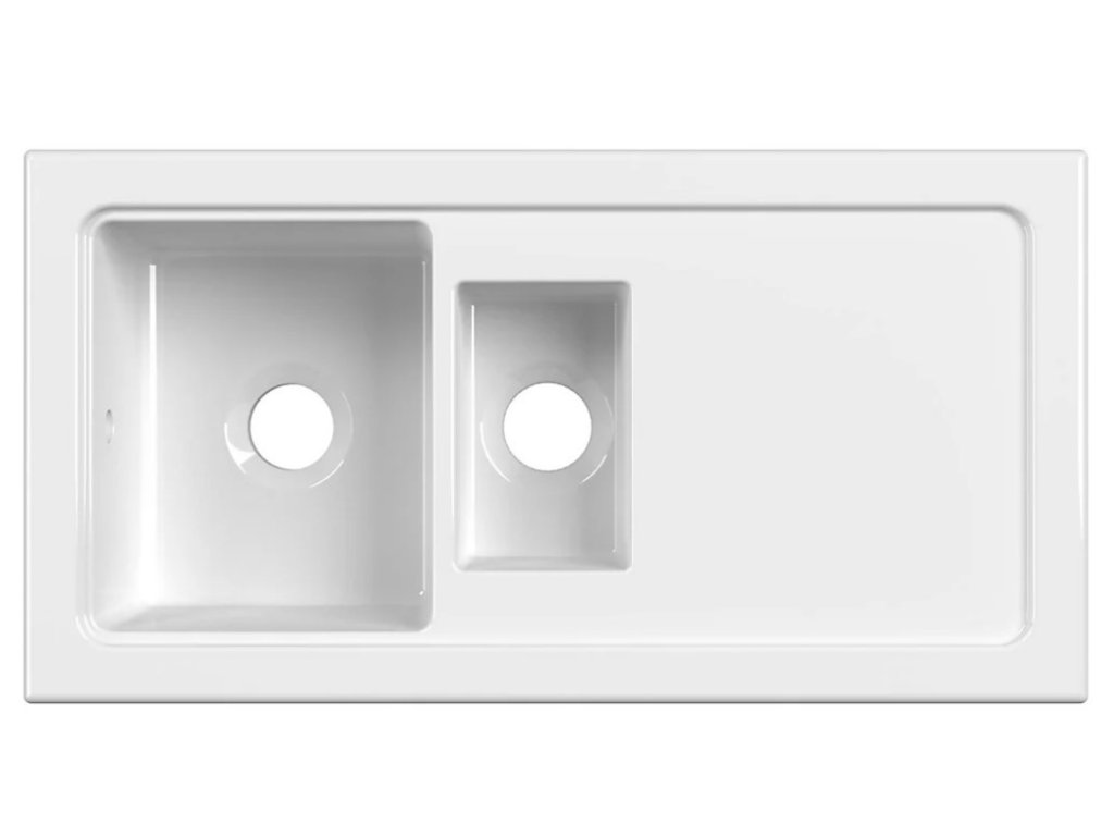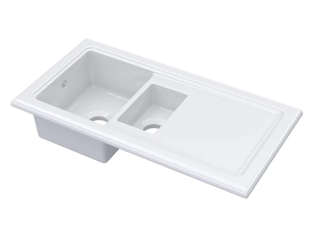 - žiarivo biely keramický drez vo vysokom lesku s odkvapkávačom a vaničkou