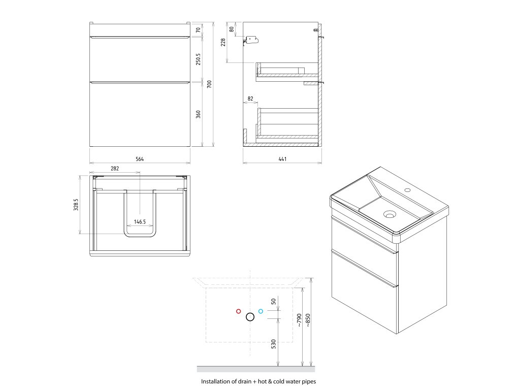 SITIA umývadlová skrinka 56,4x70x44,2cm, 2x zásuvka, dub strieborný