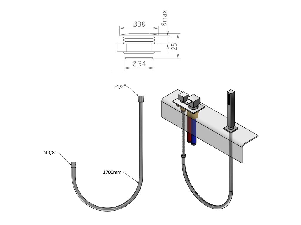Sprchová priechodka na okraj vane vrátane hadice F1/2"-M3/8", hranatá, chróm