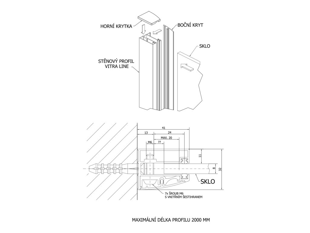 Stenový profil pre 8mm sklo vr. montážnej sady, chróm