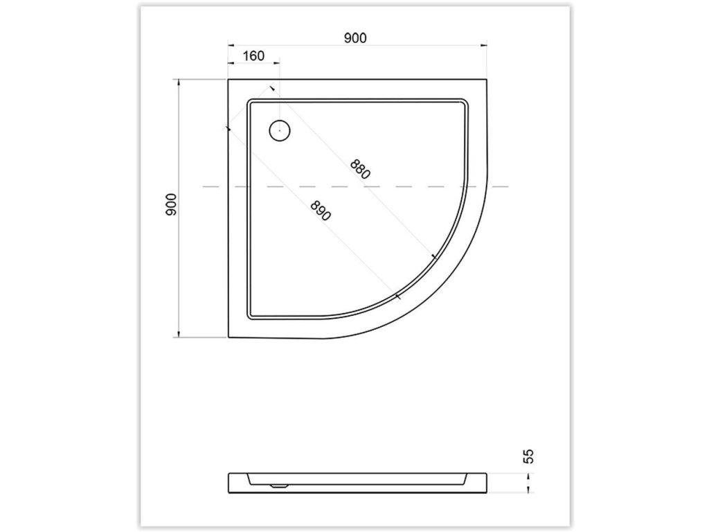 - štvrťkruh 900 × 900 × 55 mm, R550