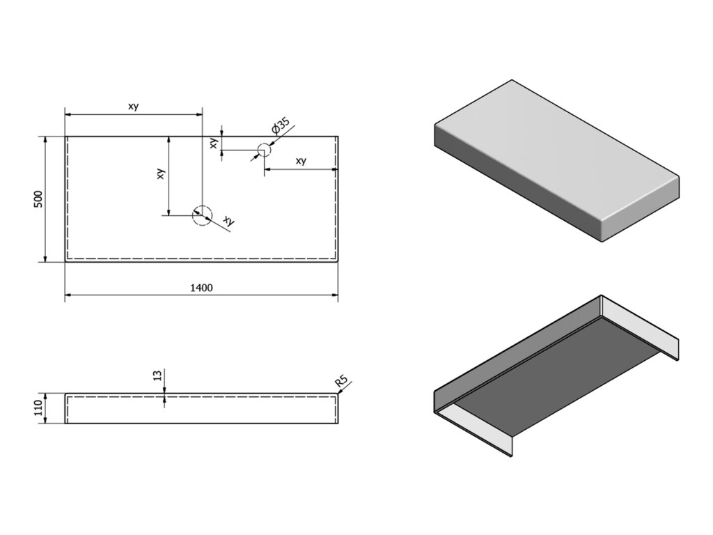 - Možnosť dodania s otvormi pre batériu a odpad podľa výkresu (možno vŕtať aj v mieste inštalácie)