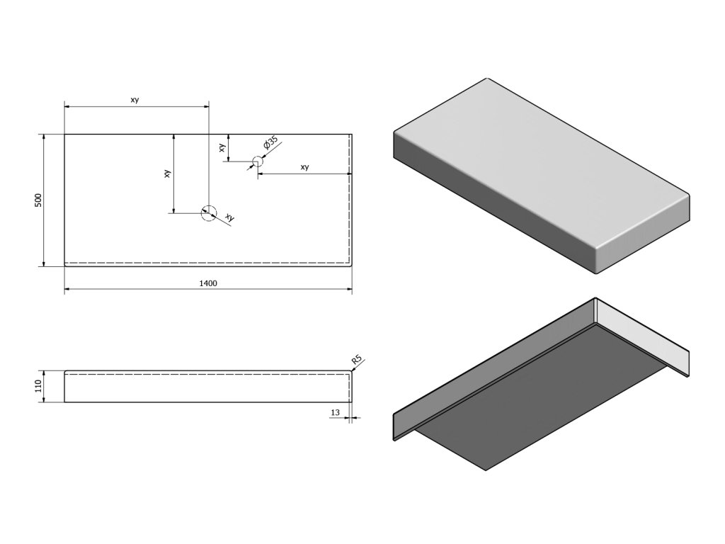 - Možnosť dodania s otvormi pre batériu a odpad podľa výkresu (možno vŕtať aj v mieste inštalácie)