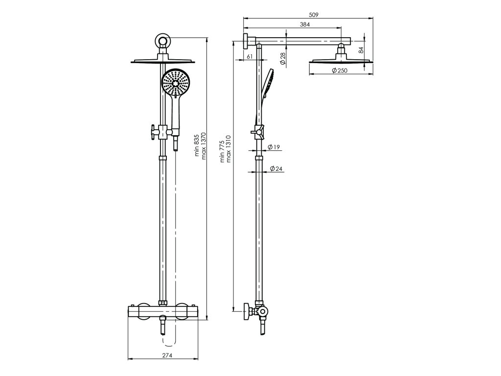 - Regulovateľná výška hlavovej sprchy 775 - 1310 mm