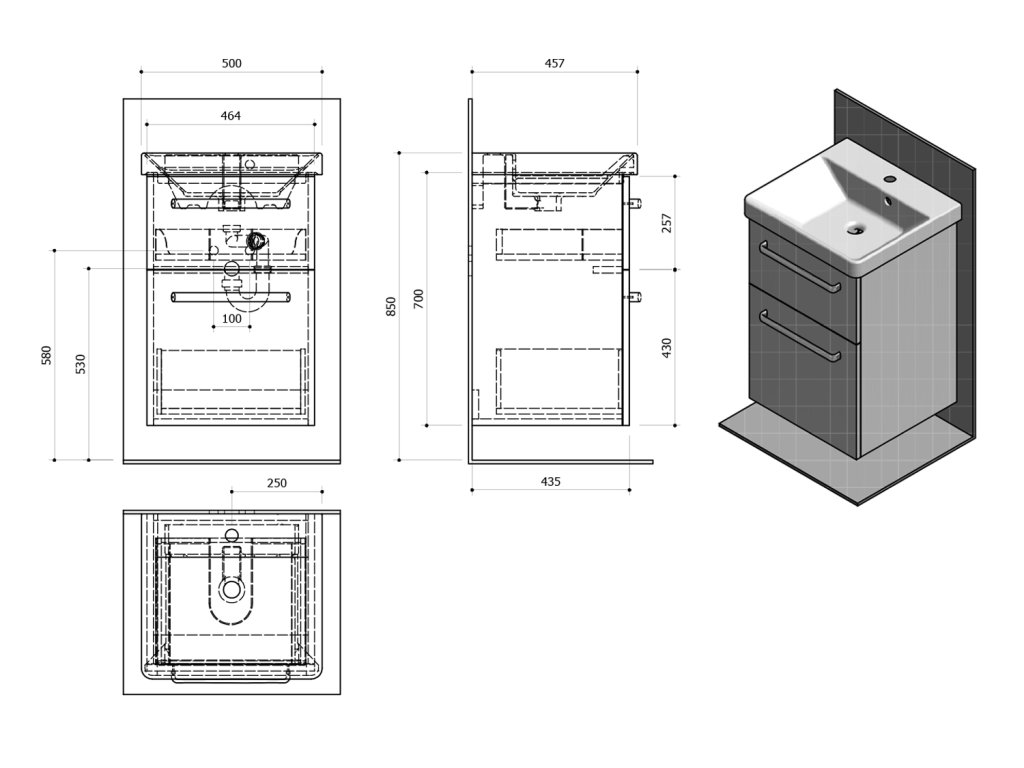 THEIA Umývadlová skrinka 46,4x70x44,2cm, 2x zásuvka, borovica rustik