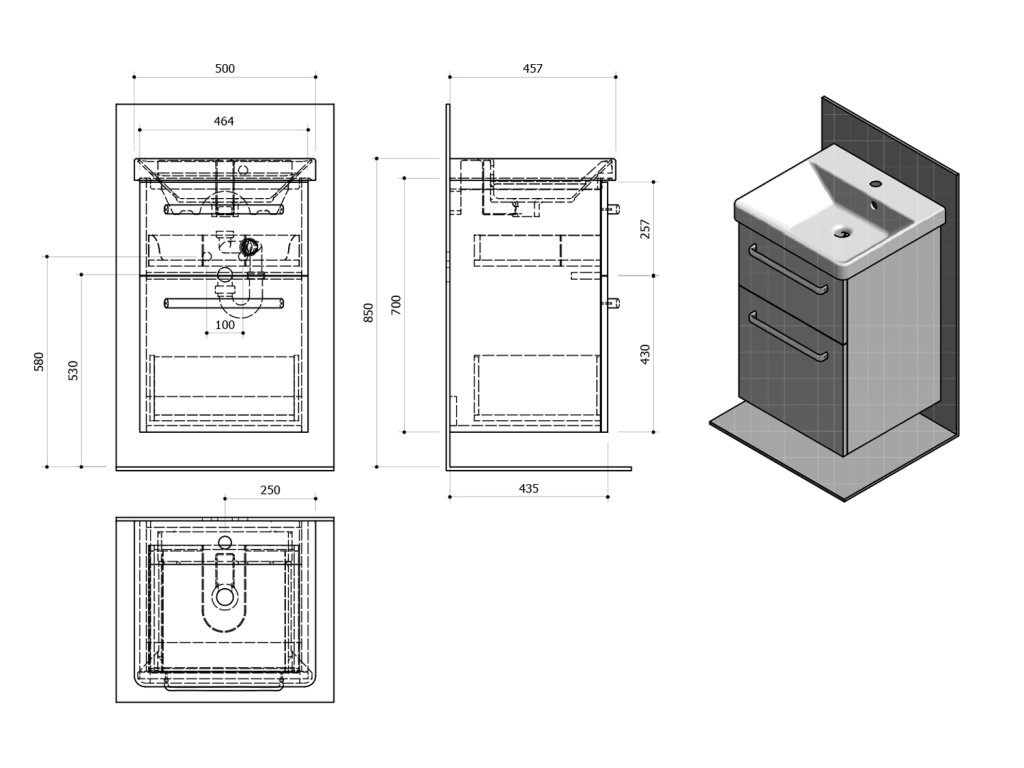 THEIA Umývadlová skrinka 46,4x70x44,2cm, 2x zásuvka, dub strieborný