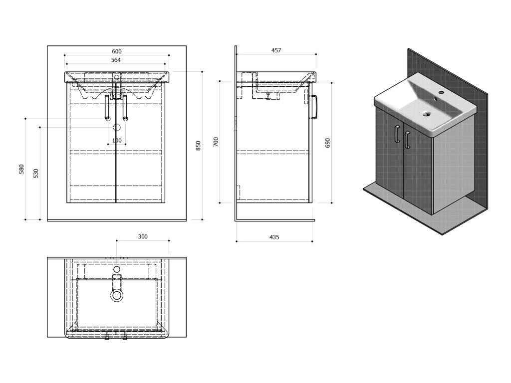 THEIA umývadlová skrinka 56,4x70x44,2cm, 2x dvierka, dub strieborný