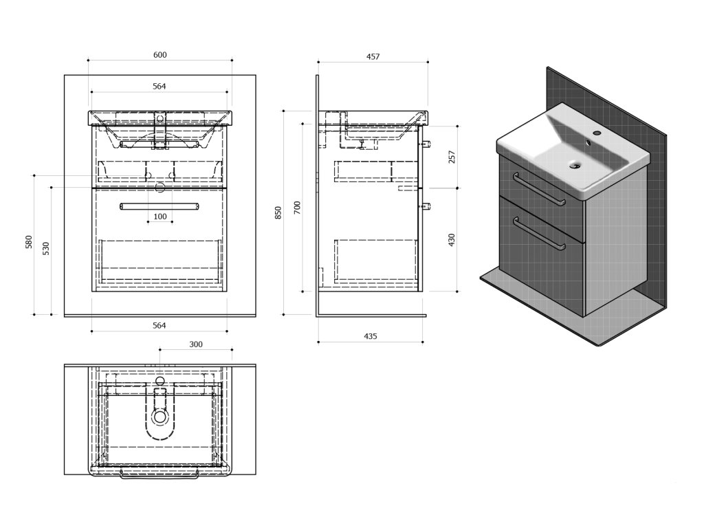 THEIA Umývadlová skrinka 56,4x70x44,2cm, 2x zásuvka, borovica rustik