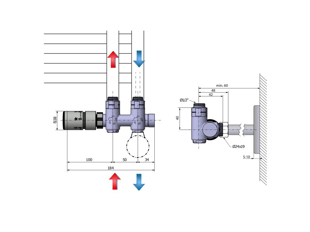Výbava | Termostat, hlavica vľavo, Stredové 50 mm |