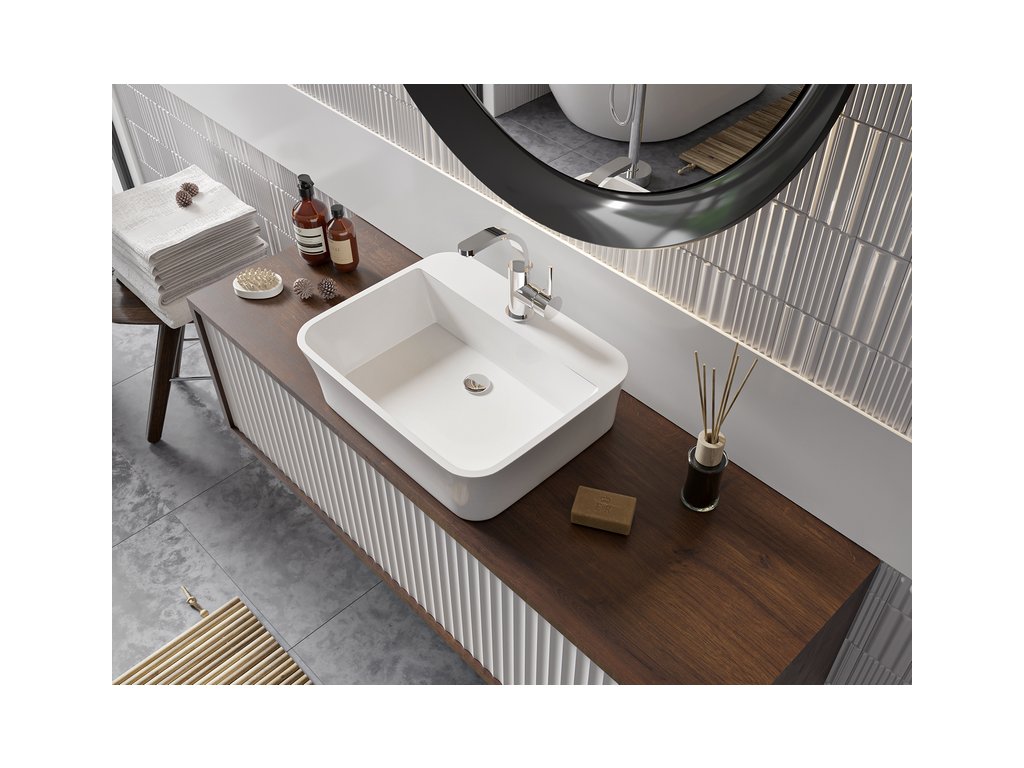 Umývadlo ASSOS S-LINE na dosku štandardne nemá otvor pre stojančekovú batériu, pre elegantné riešenie môžete použiť umývadlové podomietkové batérie, alebo umývadlové vysoké stojančekové batérie.