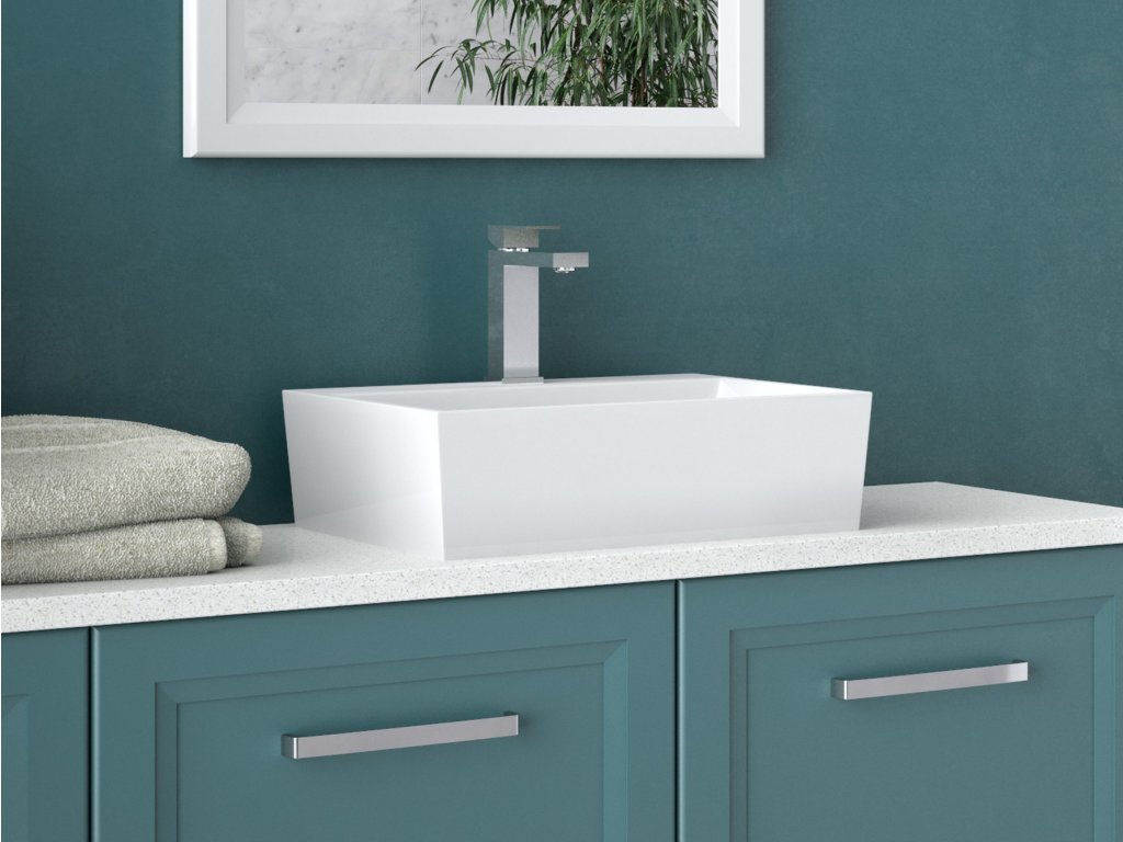 Umývadlo VERA na dosku nemá v štandardnom prevedení otvor pre stojančekovú batériu (vo výrobe je možné dorobiť bez príplatku) , pre elegantné riešenie môžete použiť umývadlové podomietkové batérie, alebo umývadlové vysoké stojančekové batérie.