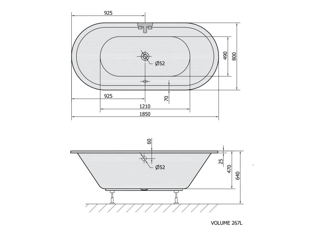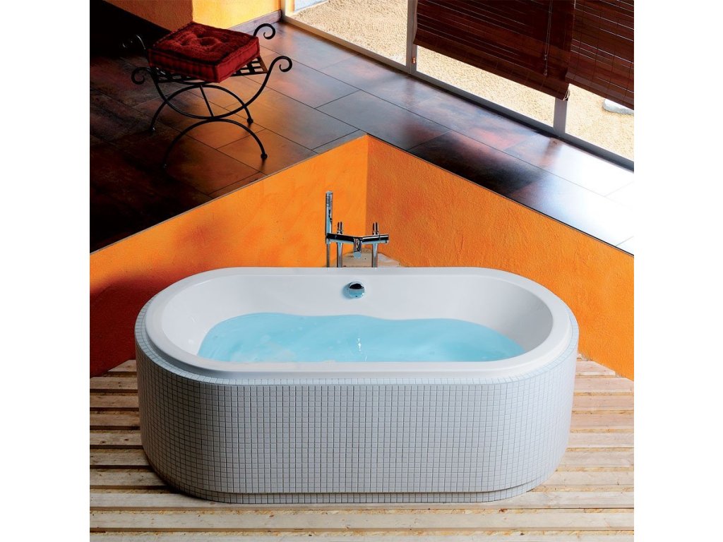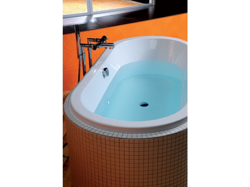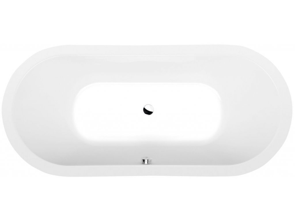 Vaňa s pohodlne tvarovanými stenami na opretie chrbta na oboch stranách a odtokom umiestneným uprostred.