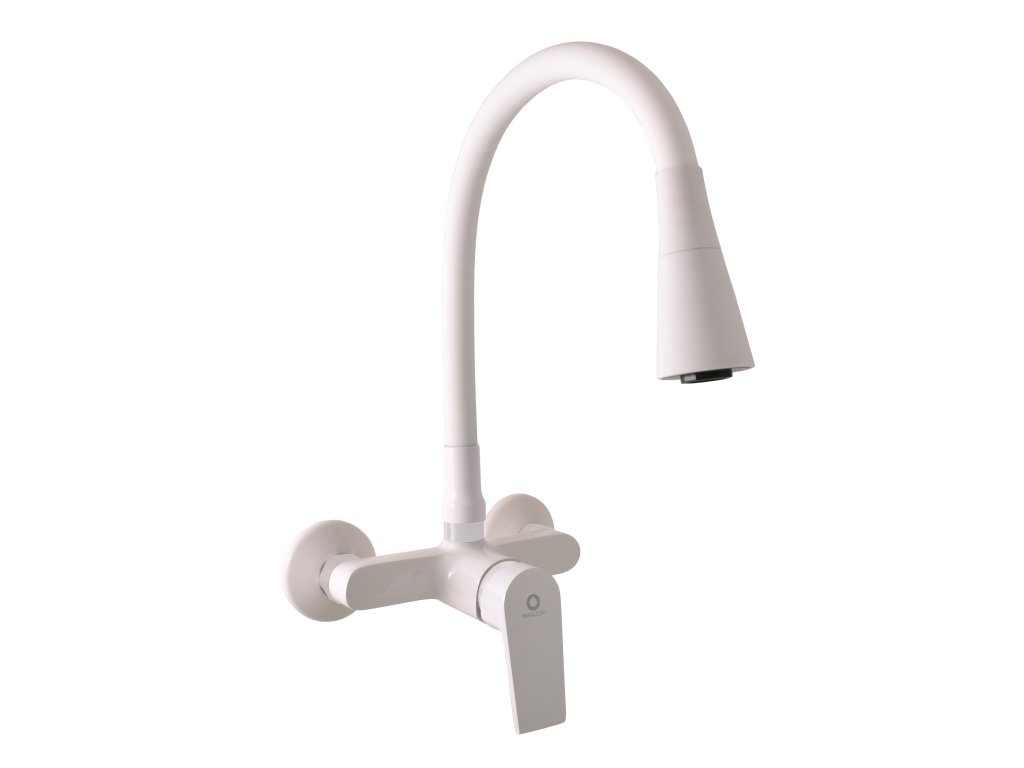 Vodovodná batéria drezová nástenná s flexibilným otočným ramienkom so sprchou.