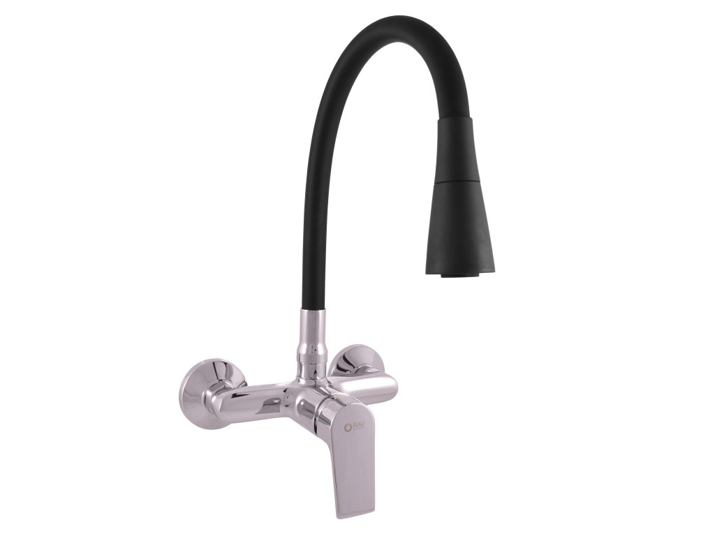 Vodovodná batéria drezová nástenná s flexibilným otočným ramienkom so sprchou.