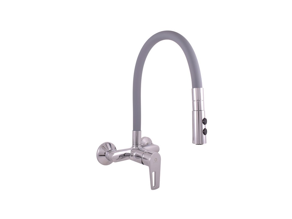Vodovodná batéria drezová nástenná s flexibilným otočným ramienkom so sprchou.