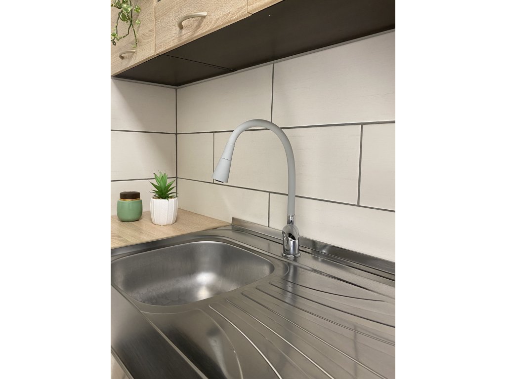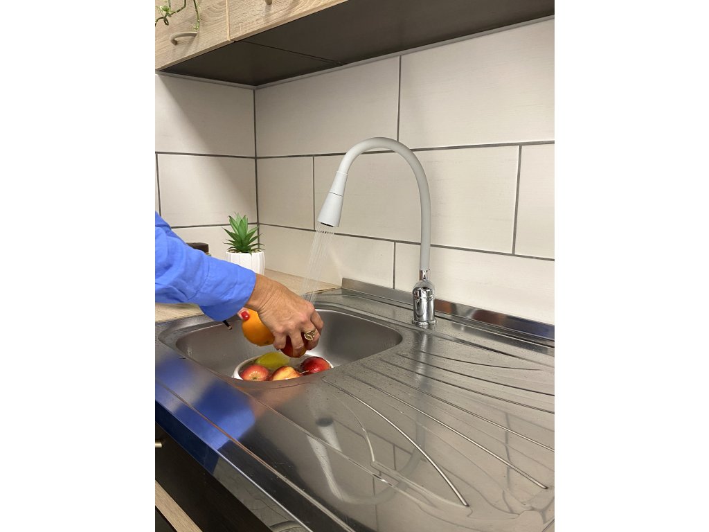 Vodovodní baterie dřezová stojánková s flexibilním otočným ramínkem se sprchou.