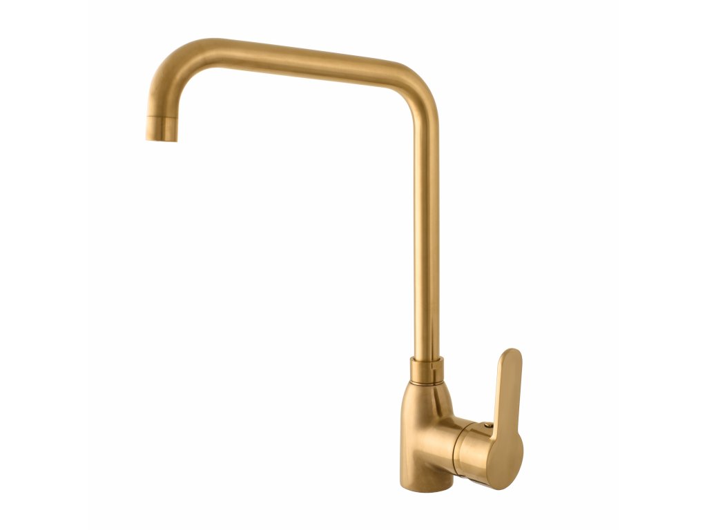 Vodovodná batéria drezová stojanková s otočným ústím, zlatá kartáčovaná.