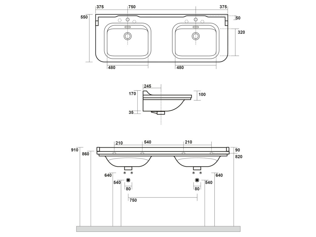 WALDORF keramické dvojumývadlo 150x55cm, čierna mat